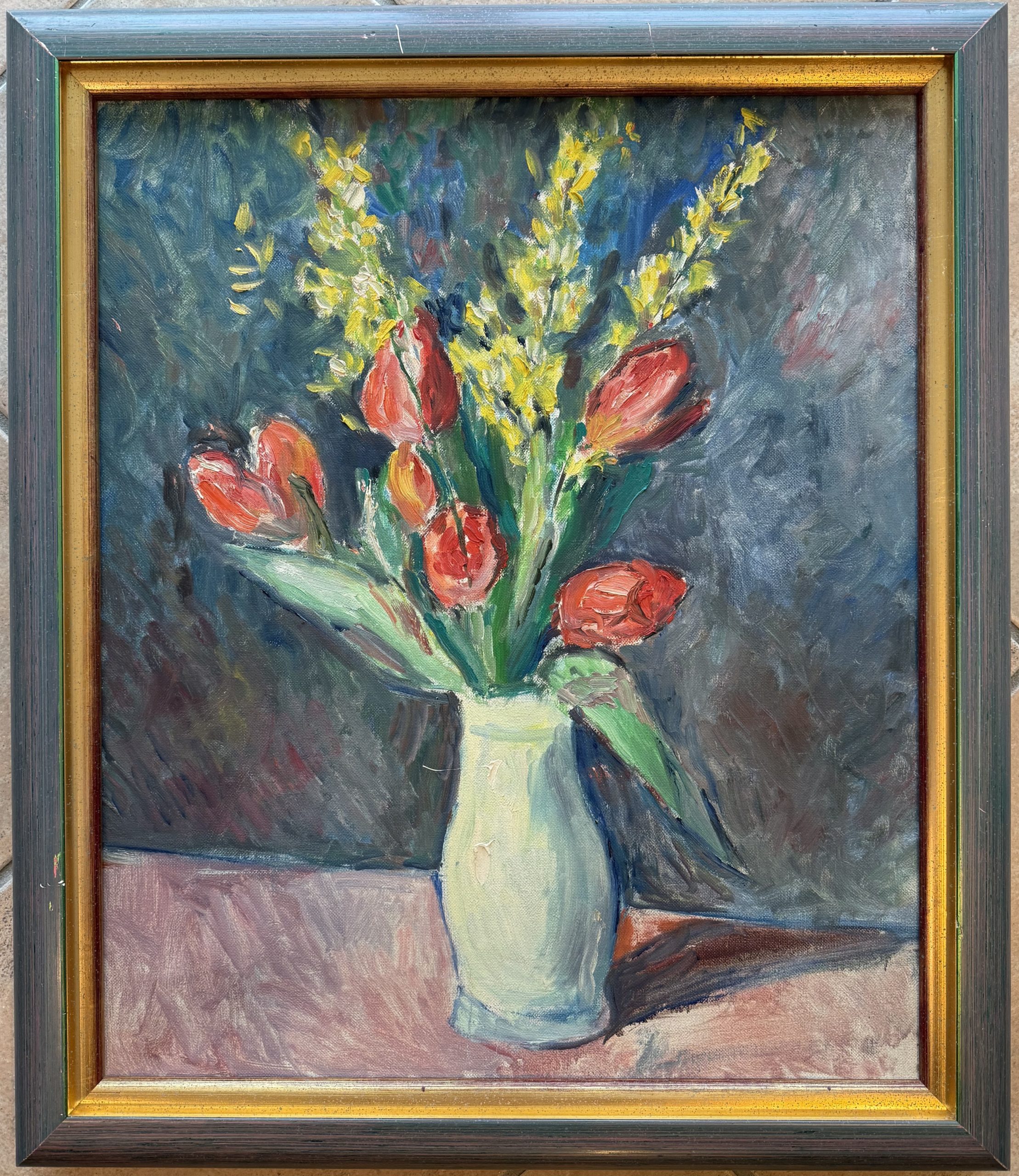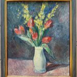 Dans Fleurs, Wüthrich déploie une palette vibrante et harmonieuse pour célébrer la délicatesse florale. Les fleurs, traitées avec générosité et précision, se détachent sur un fond subtilement travaillé, créant un équilibre élégant entre couleur et composition. La touche vive et expressive de l’artiste confère à l’ensemble une présence chaleureuse et dynamique, typique de son approche sensible de la nature morte.